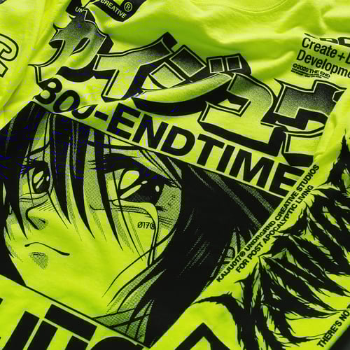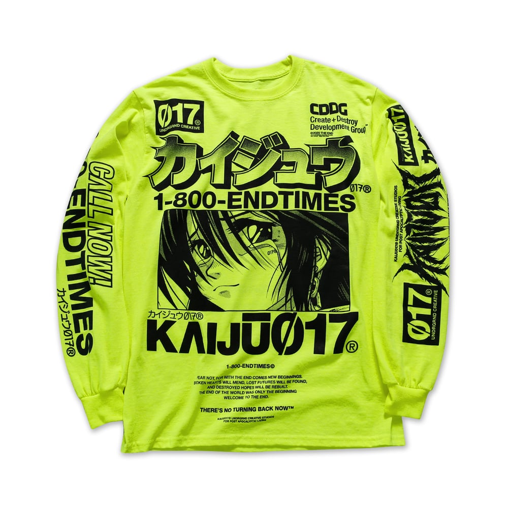 Mid weight long sleeve tee in Neo Yellow. Print color black. 50/50 cotton poly blend. Classic fit. For an oversize fit please size-up one.